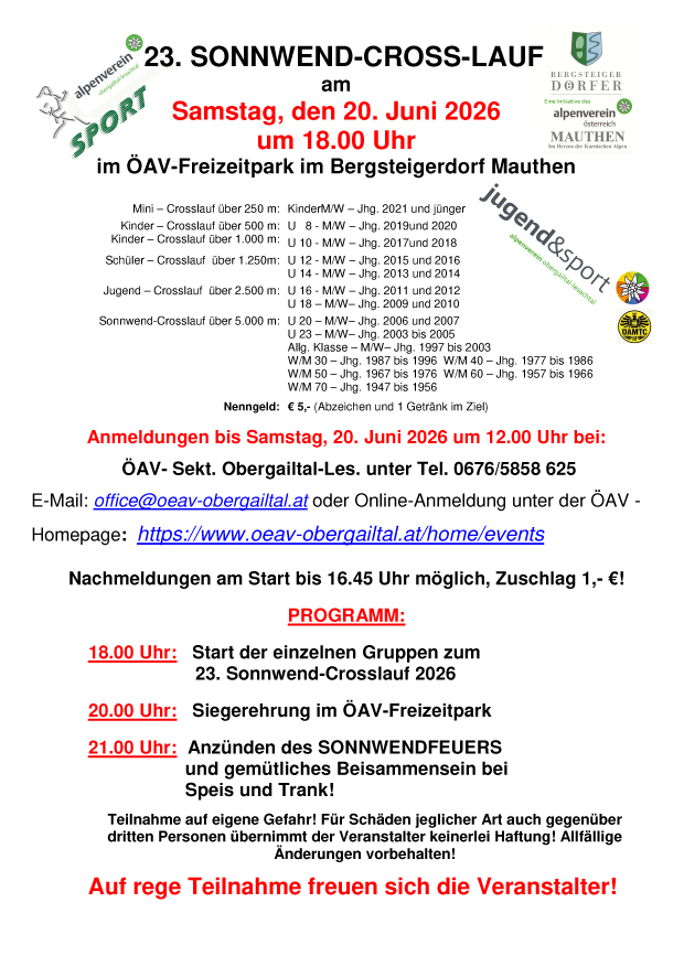 23. Sonnwendlauf am Samstag 20. Juni 2025 Ausschreibung und Einladung Anmeldung Please enable JavaScript in your browser to complete this form.Please enable JavaScript in your browser to complete this form.Sonnwend Crosslauf des Jahres (bitte Jahreszahl eintragen)Name *FirstLastGeschlechtmännlichweiblichGeburtsjahr Selected Value: 1940 Email *TelefonnummerVereinNationalitätDatenschutzerklärung *Zustimmen – Aufgrund der aktuellen Gesetzeslage zum Datenschutz in Europa (DSGVO), sind wir verpflichtet, bei jedem öffentlich zugänglichen Formular Ihre Zustimmung zu unseren Datenschutzbestimmungen einzuholen.Abschicken Aktuelle Ergebnisliste Ergebnissliste 2025Herunterladen Zur Fotogalerie Nach oben Zurück zu Events Kommentare bitte über E-Mail an die Sektion! Mail to: office@oeav-obergailtal.at
